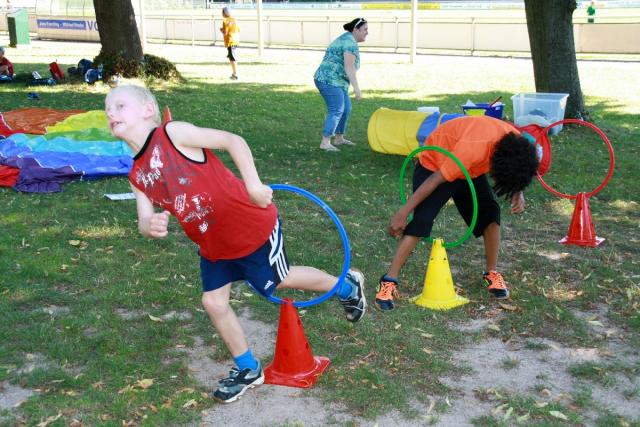Ob Wasserbecher durch den aufgebauten Parcours balancieren, den Volleyball zehn Mal hintereinander hochwerfen und wieder fangen oder mit dem Fußball durch die Hütchen dribbeln um dann zum Torschuss anzusetzen; unterschiedlichsten Herausforderungen können sich die Kinder heute stellen. Bei 35 Grad darf aber auch die Erfrischung zwischendurch nicht fehlen, welche bei manchen übermütigen Teilnehmern zu einer ganzen Wasserschlacht ausartet.