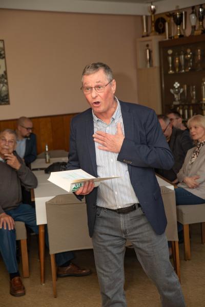 Zum Abschluss schilderte Martin „seine“ 50 Jahre in recht anekdotenhafter Form, die die Gäste so manches Mal Schmunzeln brachte. Besonders erwähnte er hier seine sportlichen Erfolge als Niedersachsenpokalsieger und DFB-Pokal-Teilnehmer, seine zahlreichen Errungenschaften im Ausbau der Infrastruktur des Vereins in Zusammenarbeit mit seinen Vorstandskolleginnen und Kollegen und der Stadt Bückeburg und erinnerte an die Erreichung vieler sozialer und gemeinschaftlicher Ziele in Kooperation mit Förderern des FC Schaumburg, der Unterstützung älterer Menschen mit dem Bürgerbataillon und der Bundeswehr oder dem nun schon traditionellen „Stadionsingen“ zu Weihnachten mit der evangelischen Landeskirche.